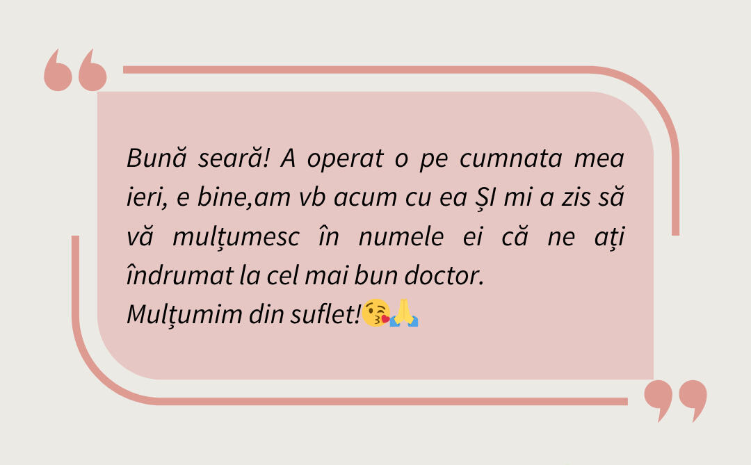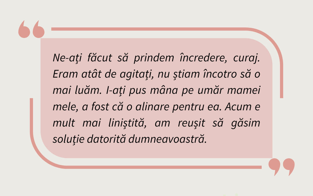 "Pentru mine, Emilia Mereanu a fost mai mult decât un sprijin – a fost omul de bază în lupta mea cu boala. Ea este cea care mi-a ghidat drumul cu lumină și iubire, omul care m-a sunat zilnic să-mi zică să nu cedez. Nu pot exprima în cuvinte cât de recunoscătoare îi sunt. Emilia este un dar pentru fiecare pacient care are nevoie de sprijin, un suflet dedicat care face lumea mai bună."